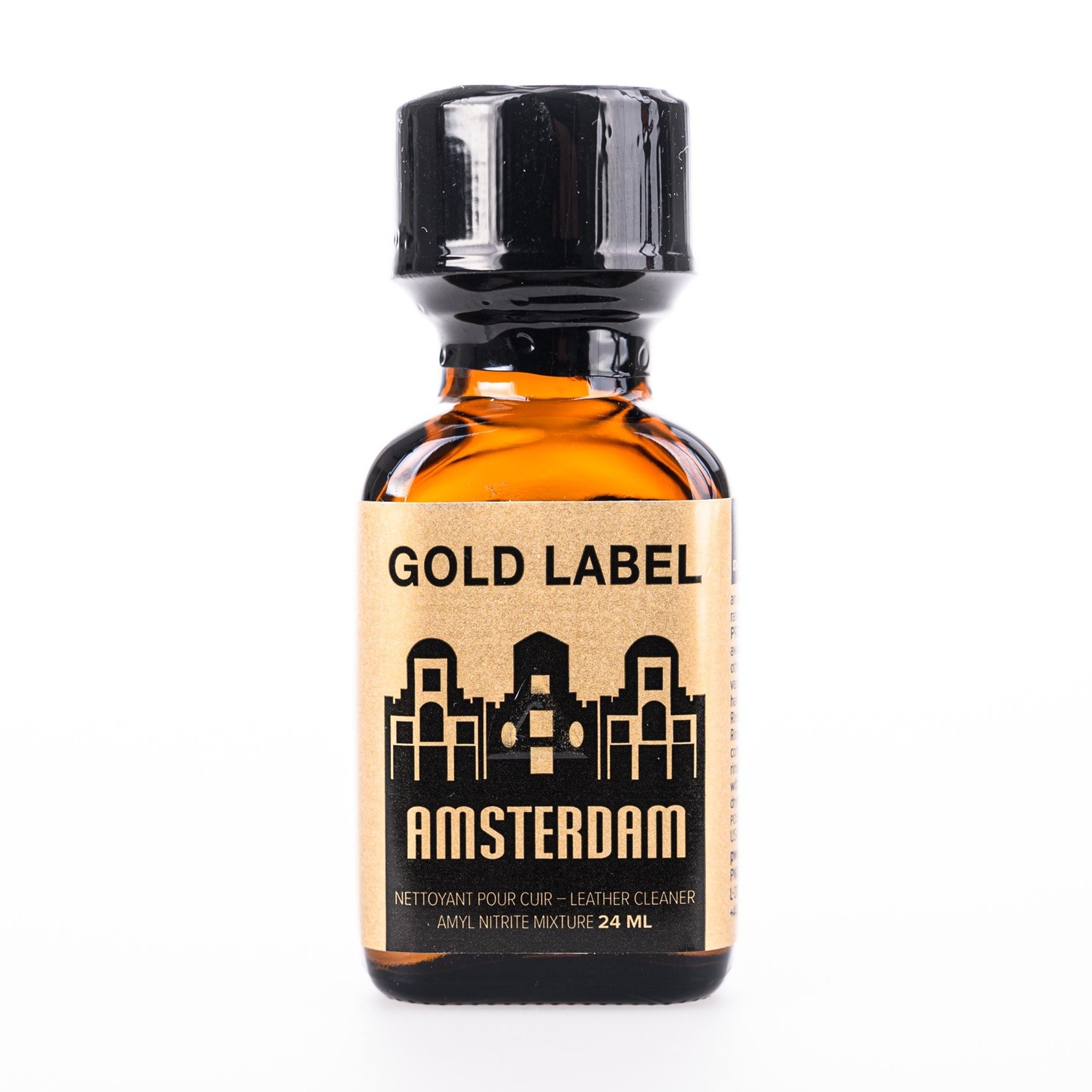 Poppers Amsterdam Gold Label 24 ml. Čistič kůže. Prodejné pouze osobám starším 18 let.