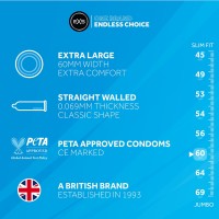 Balení 12 prémiových kondomů z přírodního latexu. Nominální šířka 69 mm, délka 221 mm. Elektronicky testované. Více informací